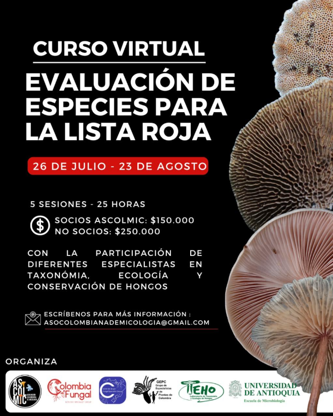 En el marco de las actividades de ASCOLMIC, se ofrecerá el curso virtual: » Evaluación de especies de macrohongos para la lista roja de la UICN» del 26 de Julio al 23 de Agosto. Este curso está dirigido a profesionales, estudiantes e interesados en el estudio de los hongos y su conservación.