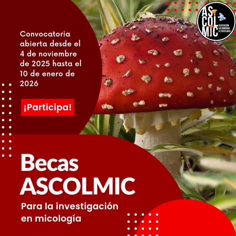 La Asociación Colombiana de Micología (ASCOLMIC) abre la convocatoria Becas ASCOLMIC para la Investigación en Micología 2025-2026, mediante la cual se otorgarán dos (2) becas de $3.000.000 COP cada una para apoyar el desarrollo de trabajos de grado de pregrado o maestría relacionados con la micología.